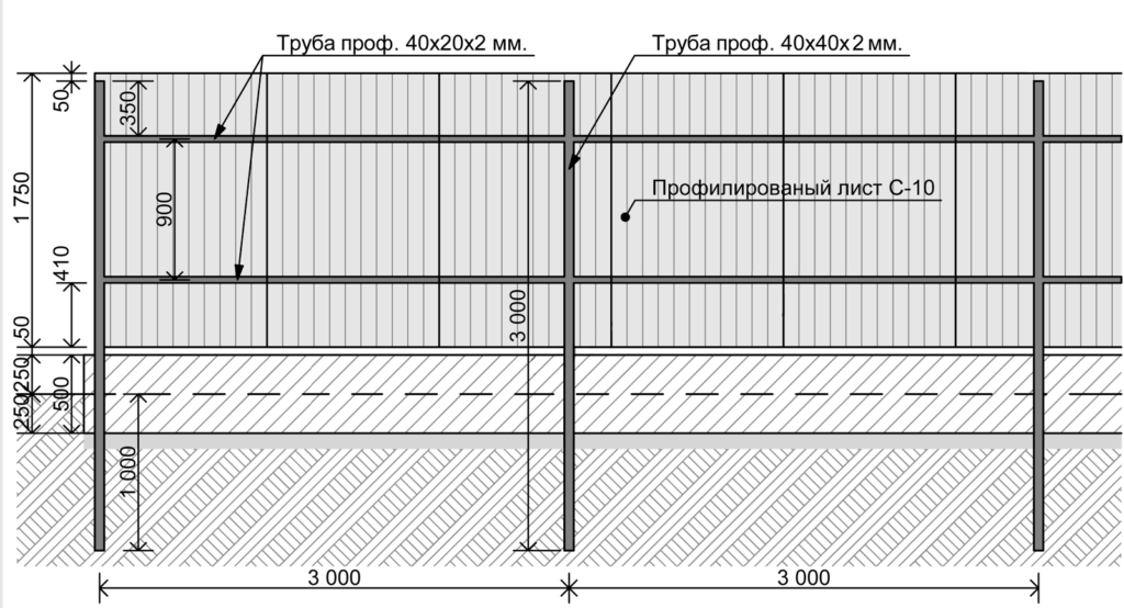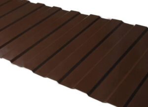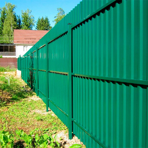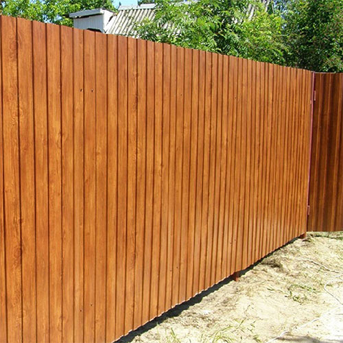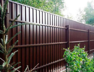 Металлопрофиль – стальной лист с ребрами жесткости и цинковым покрытием для защиты от коррозии. Наиболее востребованным является материал с дополнительным полимерным покрытием, которое увеличивает защитные свойства и придает забору эстетичности.